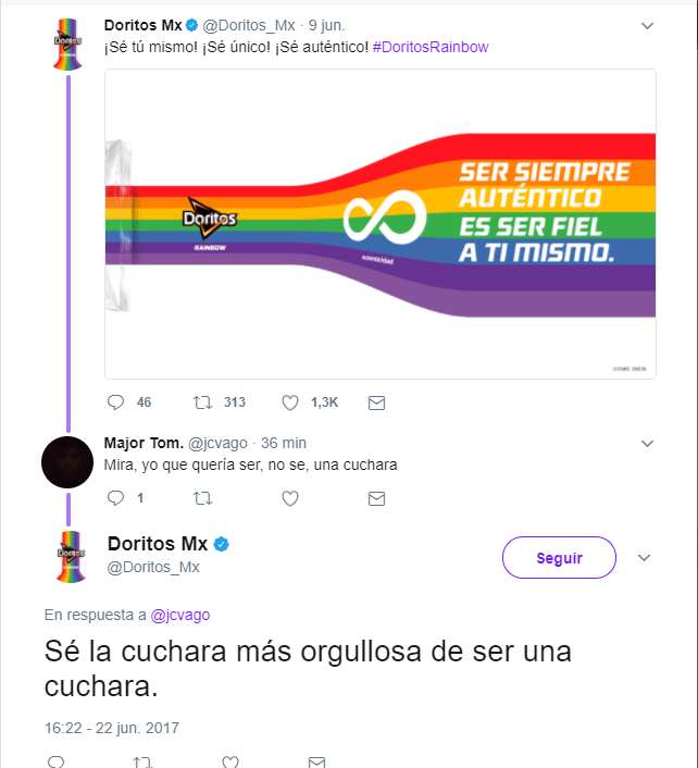 Doritos Rainbow, inició en el 2016 una campaña que defiende a la comunidad LGBT, que causó comentarios a favor y en contra, siempre contestados de manera ingeniosa por su Community Manager y bien planeados por el equipo digital de la empresa. La misma dio de qué hablar (sobre todo en redes sociales, principalmente en Twitter), en donde la comunicación fue constante. Además, la marca informó en su sitio oficial que el 100% de las ganancias de Doritos Rainbow serán destinadas a distintas fundaciones para promover la diversidad e inclusión en México, una de ellas y tal vez la más conocida, It Gets Better. Para este año, las frituras presentaron un video llamado Manifiesto 2017