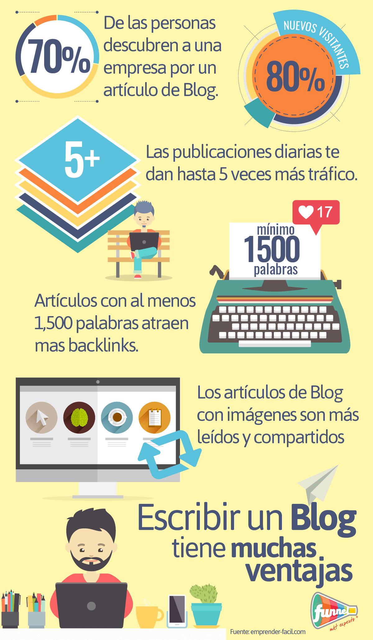 Un estudio publicado por Social Marketing Writing señala que el 70% de las personas aprenden más sobre una empresa si leen artículos que con los anuncios, además de que publicar más a menudo ayuda a acumular más visitas con mayor rapidez.
